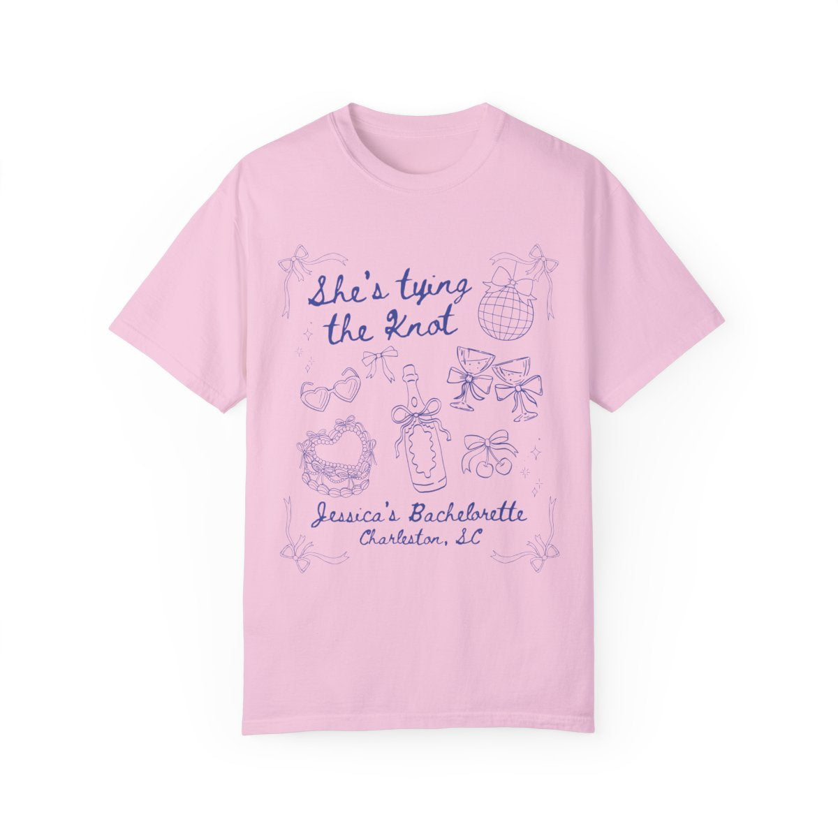 Get ready to celebrate the bride-to-be in style with our "She’s Tying the Knot" bachelorette t-shirt! This fun and flirty tee is perfect for bachelorette parties, girls' trips, and pre-wedding celebrations. Featuring adorable hand-drawn party icons and a customizable location or name, it’s the ultimate keepsake for an unforgettable weekend!