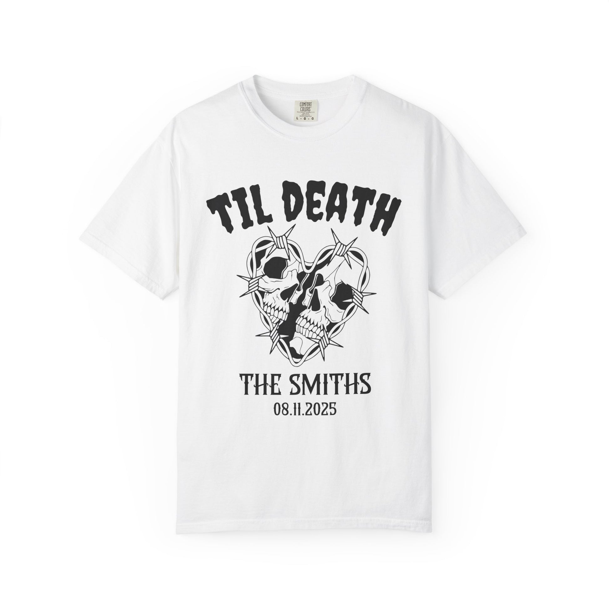 Love that lasts βtil death deserves a shirt this bold. πβ€οΈ The Til Death Personalized T-Shirt combines gothic romance with a rock-inspired edge, featuring two skulls entwined in a heart of barbed wire and your custom last name and wedding date. Perfect for couples who do forever with attitude.